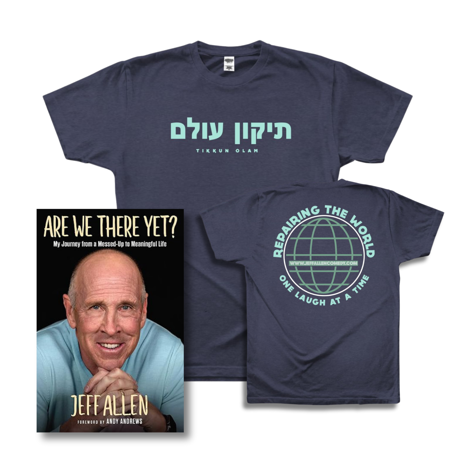 Bundle features comfort Colors 100% cotton t-shirt featuring "Tikkun Olam" and a signed copy of "Are We There Yet?: My Journey from a Messed Up to Meaningful Life." Shirt features front and back design.